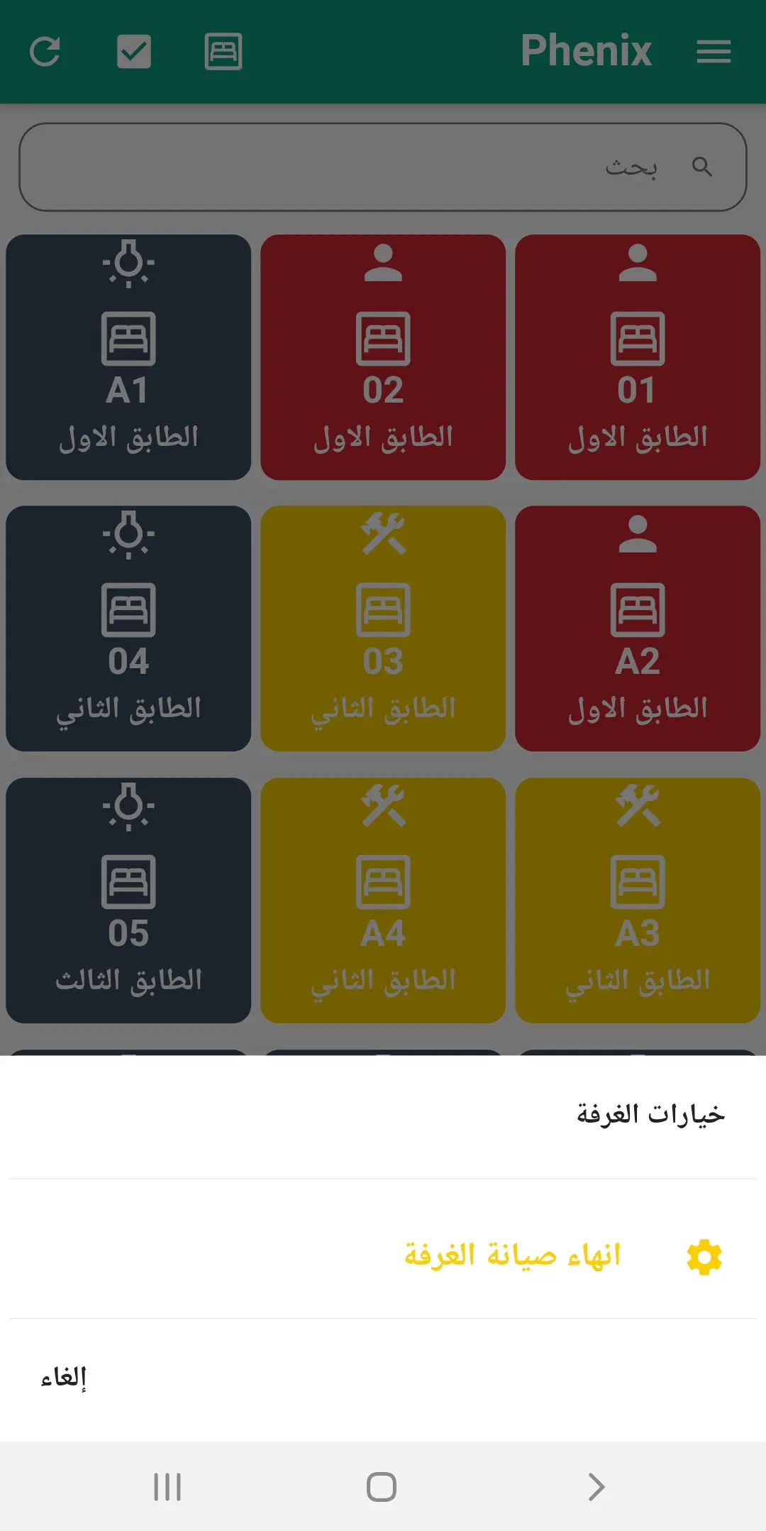 مع إمكانية الاستعراض بطريقة عرض الغرف حسب الطوابق او بشكل كامل وإمكانية التمييز بين الغرف المشغولة والغرف قيد الصيانة والغرف قيد التنظيف والغرف الشاغرة.